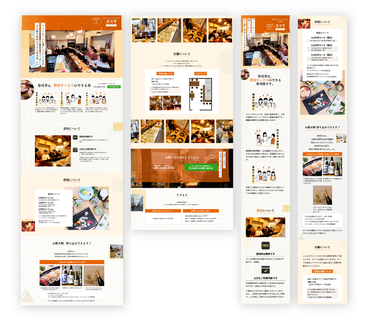 主人のお店、日本橋寿司幸の貸切LPをデザインしました。 少人数での貸切が可能で、お酒の持ち込みもOKな寿司屋なので、アットホームで楽しそうな雰囲気が伝わるLPに仕上げています。