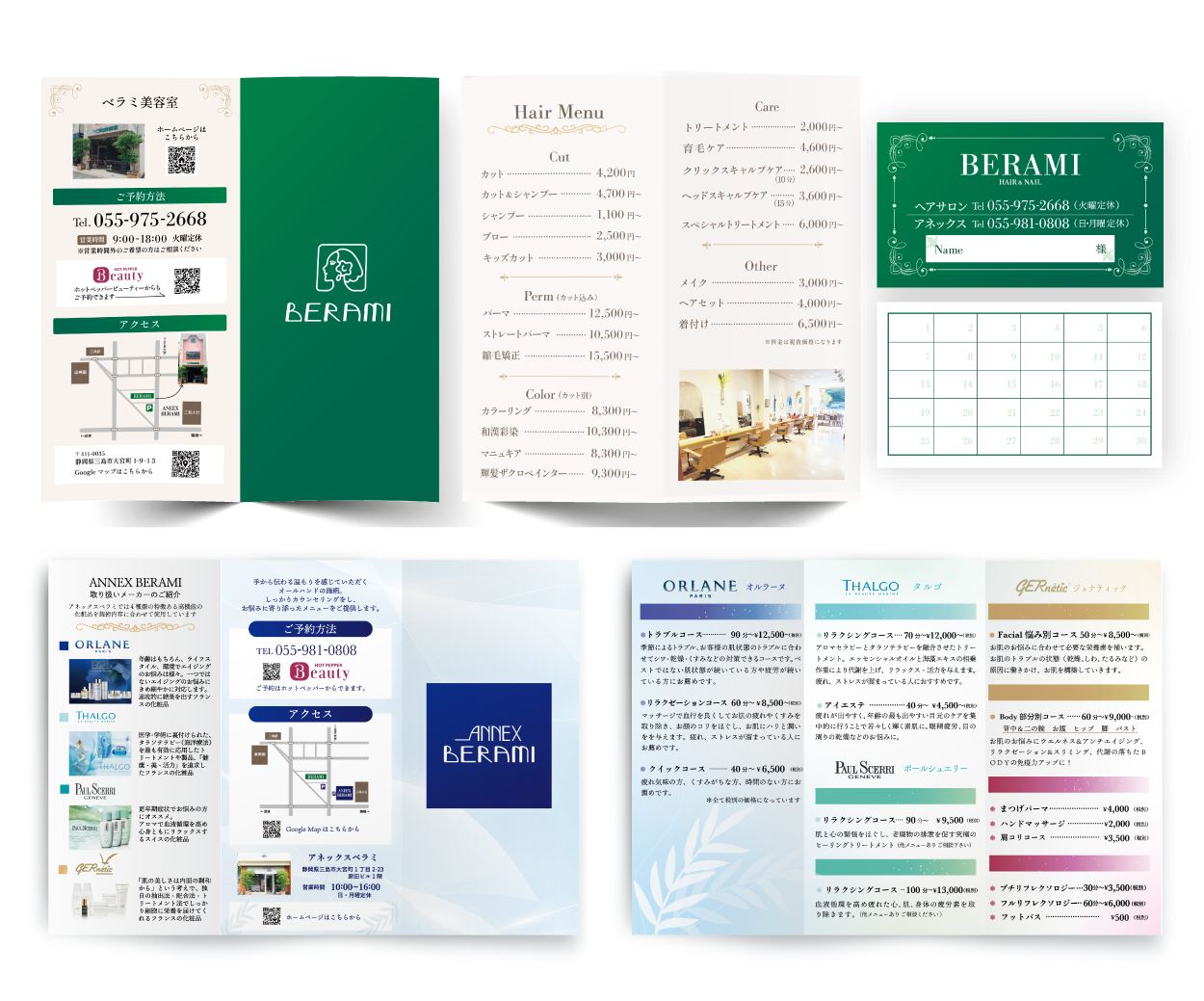 パンフレットは40代後半以降のお客様が多いことを考慮し、見やすさと文字の大きさに配慮してデザインしました。 ベラミアネックスのパンフレットの方は、こだわりの高機能メーカーを複数導入されており、メーカーごとのファンも多いとのことでしたので、それぞれの機能紹介を充実させ、メニューもメーカー別に分けて掲載しています。