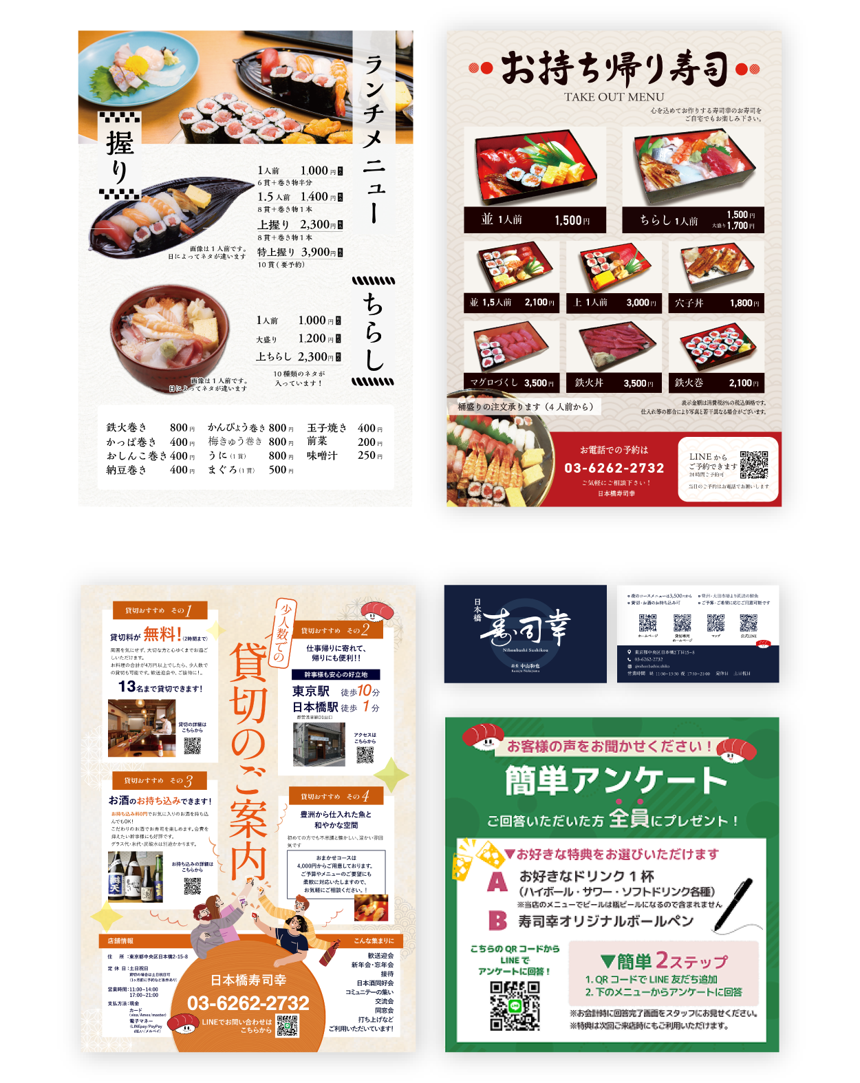 日本橋にある寿司店「日本橋寿司幸」のWebサイト、ロゴデザイン、販促ツールを制作しました。 デザインについて、寿司屋の雰囲気を保ちつつ、コストパフォーマンスの良さと、初めての方でも気軽に入店できる親しみやすさを感じられるデザインにしました。 ロゴ・筆文字は、格式張りすぎない、温かみのあるトーンで制作しています。 高級そうという心理的ハードルを下げ、幅広い層のお客様が安心して足を運べるような、柔らかく安心感のある構成に仕上げました。