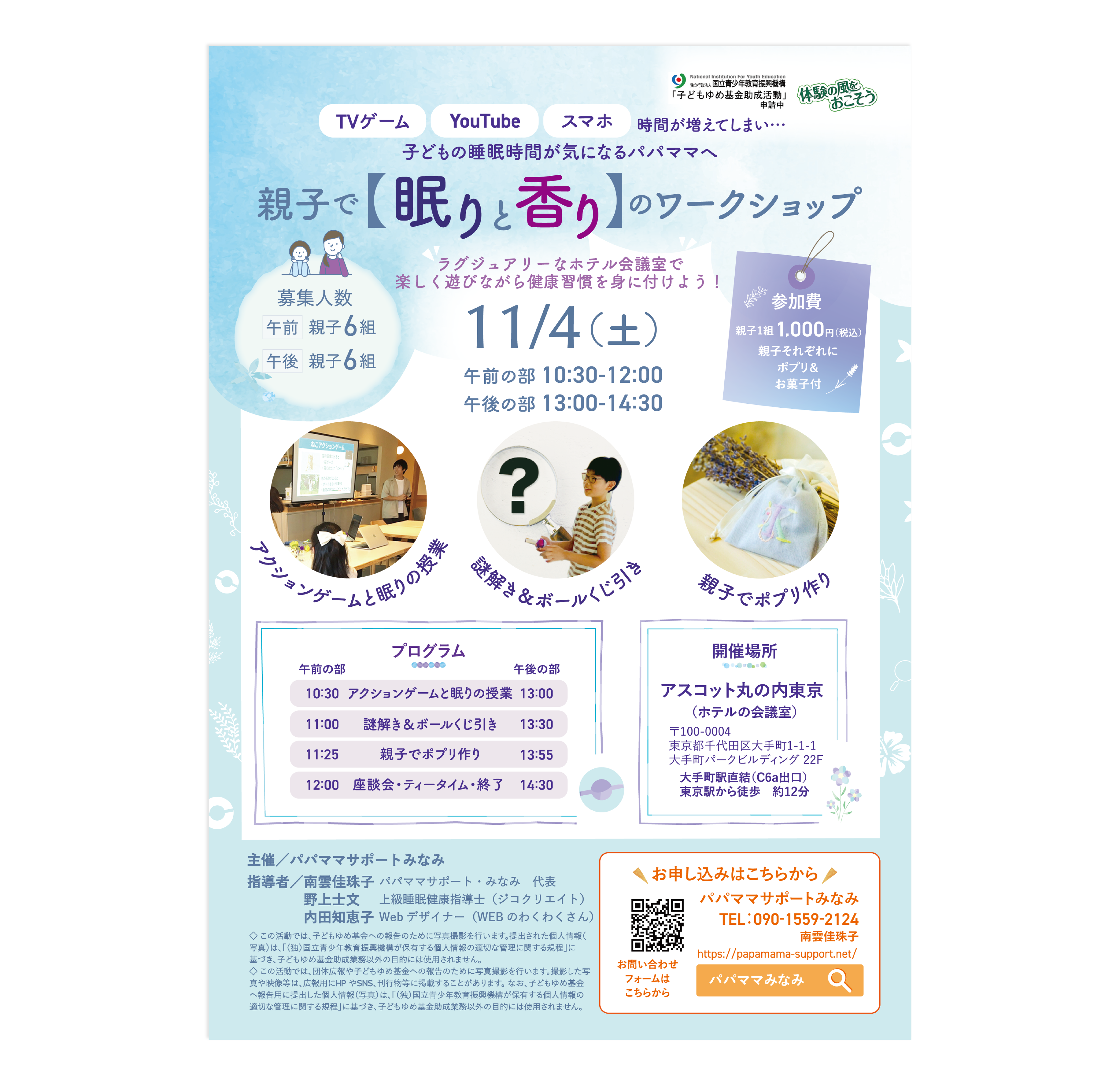 パパママサポート・みなみ様は、地域の子育てコミュニティを運営し、親子で楽しみながら「生きる力」を身につけるイベントを企画されています。 活動の想いをカタチにするため、イベントのチラシを制作しました。
