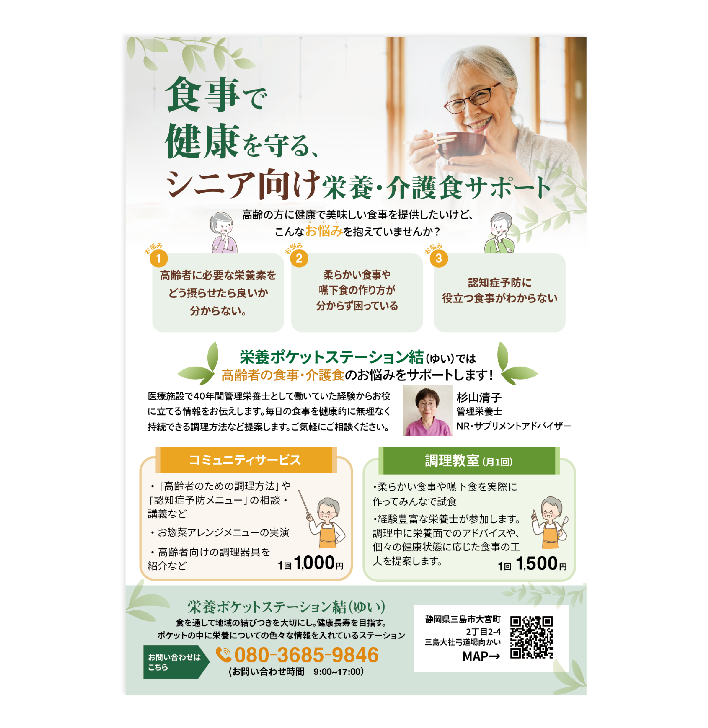 栄養ポケットステーション結(ゆい)様の、チラシをデザインしました。高齢者の方を対象に、調理や栄養指導を行っている管理栄養士の方です。
